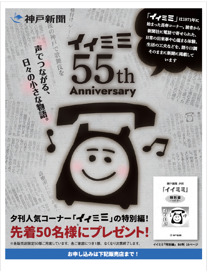 http://kobe-shimbun.com/?p=1255http://kobe-shimbun.com/wp-content/uploads/2026/02/スクリーンショット-2026-02-16-132535.pnghttp://kobe-shimbun.com/wp-content/uploads/2026/02/スクリーンショット-2026-02-16-132535-150x150.pngお知らせイベント新着夕刊人気コーナー「イイミミ」の特別編を先着50名様にプレゼント! 「イイミミ」は1971年に始まった長寿コーナー。読者から新聞社に電話で寄せられた、日常の出来事や心温まる体験、生活の工夫などを、語り口調そのままに新聞に掲載しています。 残りわずかとなっております。お申し込みは販売店まで! 神戸新聞 明舞・舞子専売所 TEL 078-783-1122yasuko junichi.izuka@gmail.comAdministrator神戸新聞 明舞・舞子販売所
